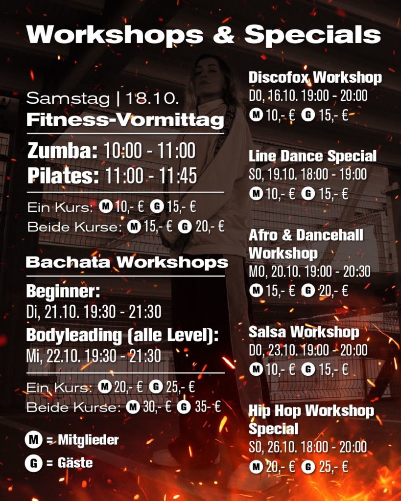 Dienstag 21.10. Mittwoch 22.10. | Herbstferien-Workshops 19:30-21:30 Uhr Thema „Beginner Crashkurs“ 19:30-21:30 Uhr Thema „Bodyleading“ für alle Levels | time to dance | Ein Workshop Mitglieder 20€, Gäste 25€ Beide Workshops Mitglieder 30€, Gäste 35€ |